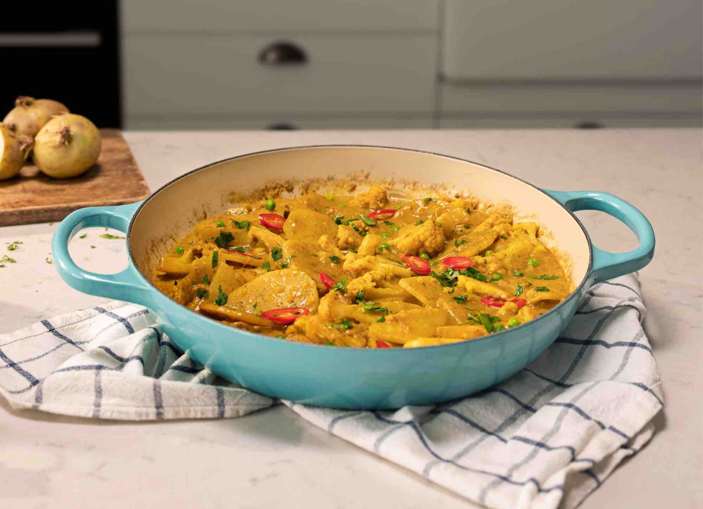 - Versare il latte di cocco e cuocere a fuoco lento fino a quando le verdure sono tenere. Aggiungere sale a piacere e servire caldo con riso.